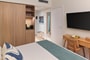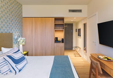 Discover modern comfort in our Deluxe Room with Pool View, a stylish accommodation choice for guests seeking a vibrant stay in Rhodes. Designed with natural textures and soothing blue tones, the room reflects the relaxed spirit of island living within our five-star resort in Kolymbia. Overlooking the resort’s swimming pool, this category places you close to the lively holiday atmosphere while offering a bright and comfortable retreat to unwind after a day at the beach. An ideal option for couples or small families looking for a premium room experience in a Rhodes family resort.