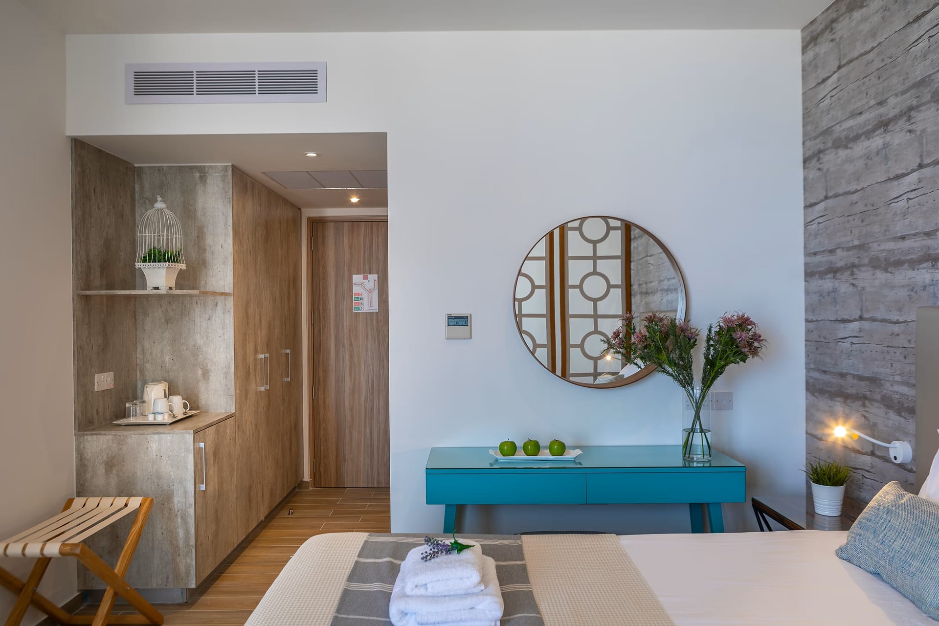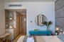 Soft earth tones create a relaxed and harmonious atmosphere throughout the room. The private veranda includes a seating area and opens to views of the surrounding hills of Paphos, offering a peaceful backdrop away from the resort’s main activity areas.