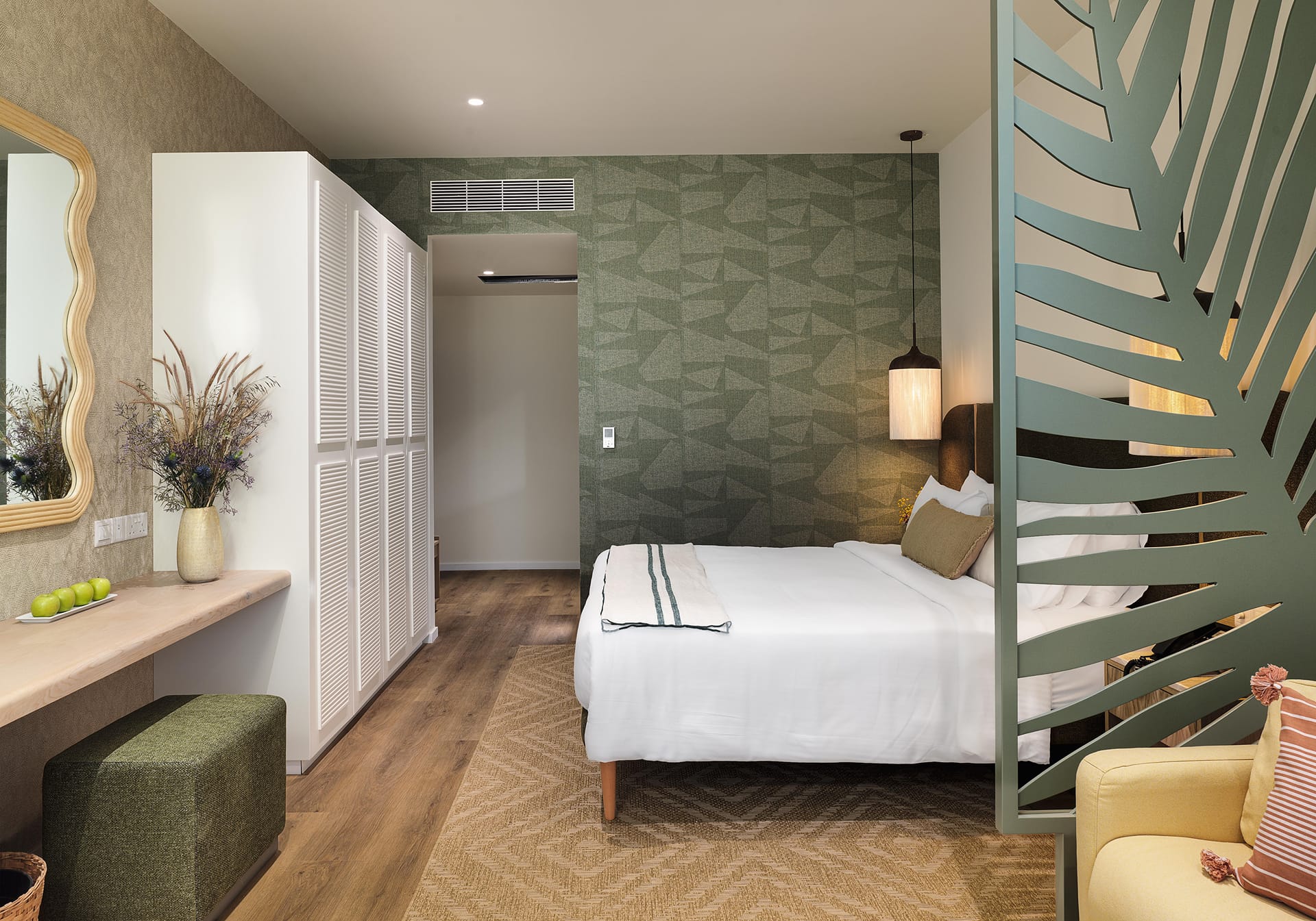 The Junior Suite Garden View offers a comfortable and well-organised space with a contemporary Mediterranean design and natural influences. The layout is simple and easy to use, supporting a relaxed stay. The suite includes every day in-room comforts for a smooth stay, while a private balcony overlooks the gardens and creates a quiet outdoor extension of the room.