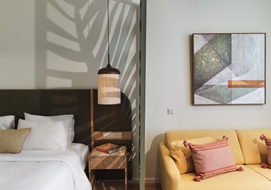 Designed with a clear connection to the sea, this Junior Suite feels open and relaxed, with natural light shaping the space throughout the day. The contemporary Mediterranean style is expressed through soft colours and natural finishes, creating a calm indoor setting.